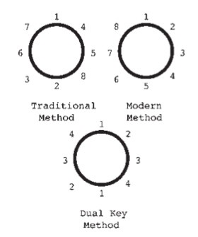 There are a few ways to move the key from lug to lug. Back when heads were made out of actual skin, it was important to get equal tension as the head seated. This was accomplished by tuning a lug then moving to the opposite lug. This is known as the traditional method. As manufacturing materials and techniques improved some companies advised moving in a sequential pattern around the drum. This is the modern method. A permutation of the two is the dual key method. Place two keys on opposite lugs and tune. Move to an adjacent lug and it's opposite and continue until the drum is in tune. I prefer this dual key method because it speeds tuning and it blends the first two approaches. The following diagram shows the tuning sequence on an eight lug drum using each of these methods.