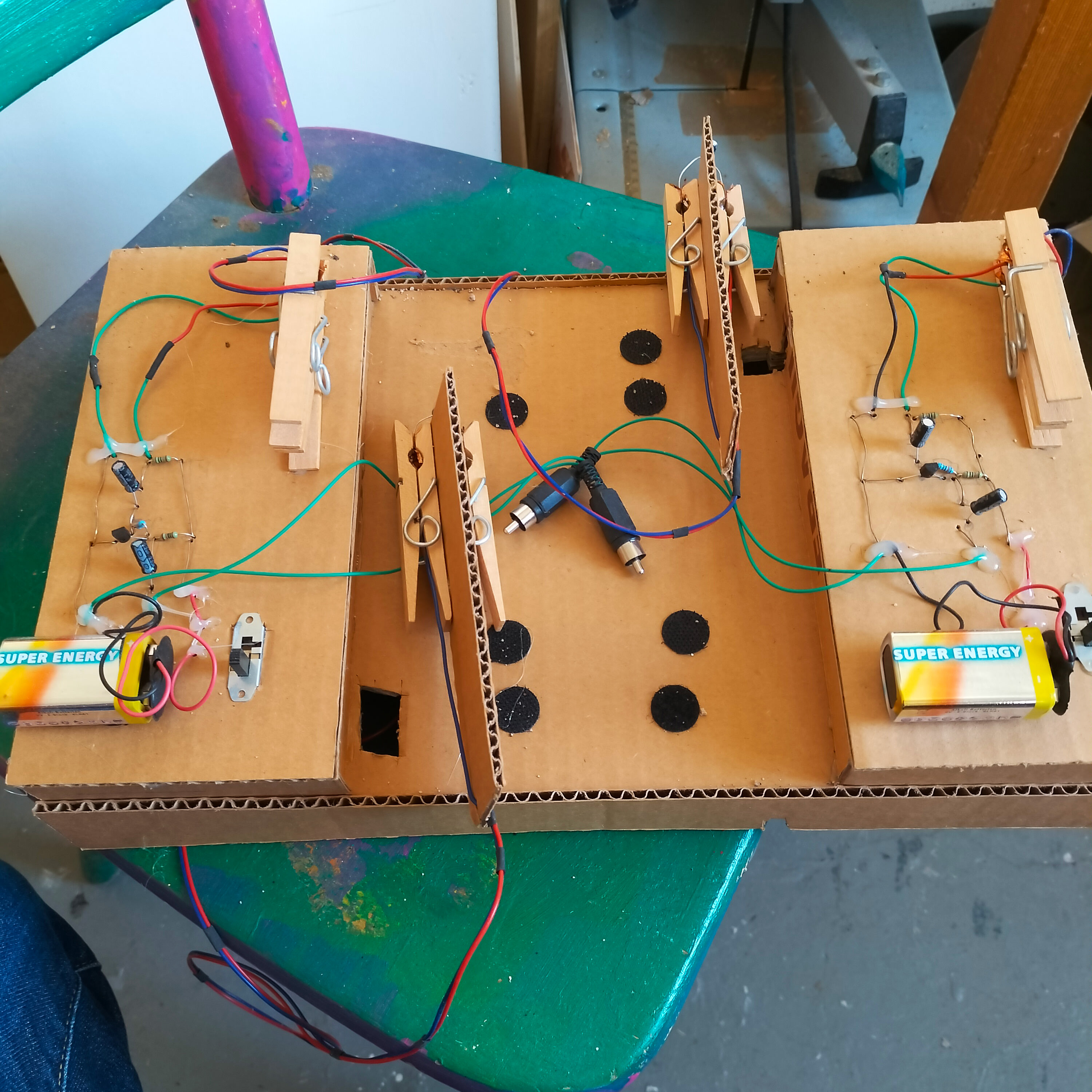 I made a PVC clarinet. Oh yeah, and I made a cardboard saxophone. I'll never do it again! It was a mistake, but it's not that bad. Imagine a long, skinny pyramid out of papier-mâché and cardboard. I put a saxophone mouthpiece on it, blew into it, and it made a resonant, nice sound. I started cutting holes in it, and I cut plywood keys. Then I had to make the keys airtight. If you don't make them airtight, they don't work at all. When you start cutting holes in the papier-mâché, it quits being resonant. It's not very musical, and I'm constantly having to repair it. I don't recommend building saxophones! [laughter]